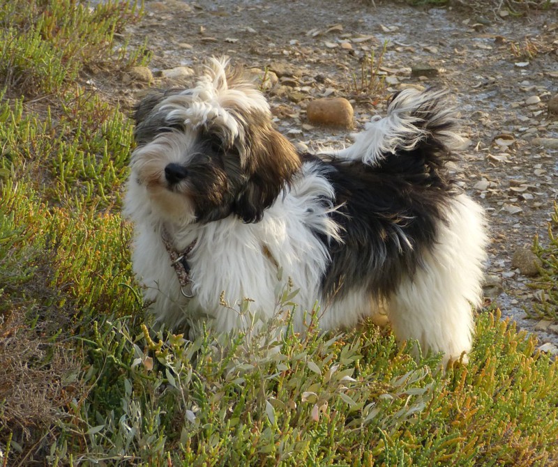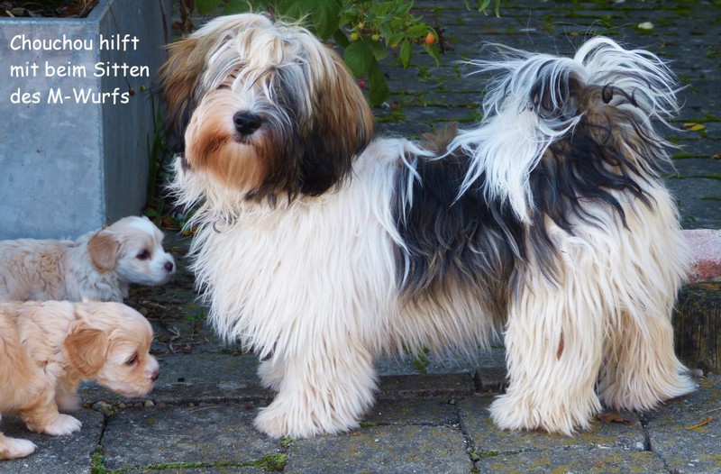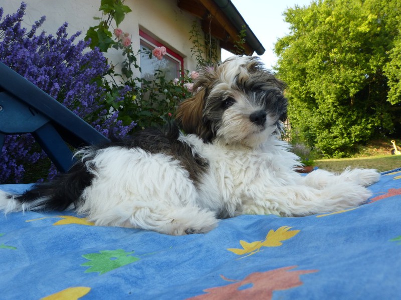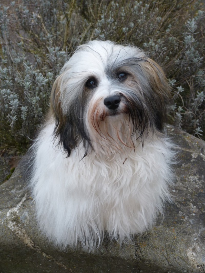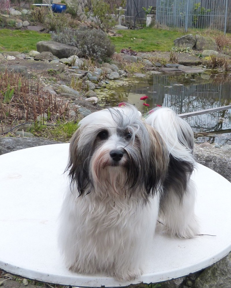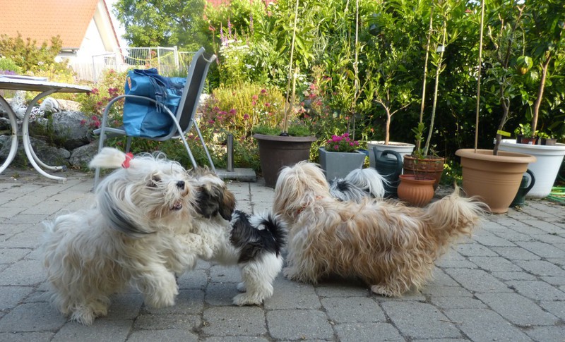 Chouchou ist extrem wendig und sportlich und liebt es, durchs Gelände zu rasen. Wie alle Havis steht sie auf Plüschtiere, mit denen sie sich auch gerne selber beschäftigt. Inzwischen legt sie davon auch keine Depots mehr im Garten an - in den Wochen nach ihrem Einzug bei uns neigte sie hierin zu räuberischer Vorratshaltung: Baby Hannas Spielzeug verschwand mitunter so schnell von der Krabbeldecke, dass wir erst die (uns zum Glück schon bekannten) Depots aufsuchen und ausräumen mussten - allesamt an lauschigen Plätzchen im Garten befindlich, bis das Baby wieder alle Plüschtiere und Beißringe hatte. Chouchou liebt es zu kuscheln und schafft es, in gestreckter Relaxhaltung auf dem Rücken ein Drittel des großen Sofas zu blockieren. Eine weitere Eigenart ist ihre Art der Kontaktaufnahme: Menschen und Hunde möchte sie am liebsten immer mit der Nase gaaaanz nahe kommen und dort beriechen. Während sich viele Zweibeiner darüber freuen, dass sie gleich so intim wird, finden fremde Hunde das eher ungezogen und unangemessen indiskret und dreist. Chouchou ist eine absolut treue und liebe Seele und wie ein typischer Havi ein Schatten ihrer Zweibeiner - wo diese sind, will auch sie sein. Schon im zarten Alter von 10 Wochen begleitete sie Frauchen selbstverständlich ohne Leine durch Baumärkte und Gartencenter.