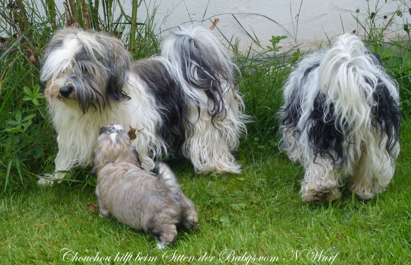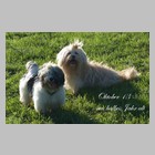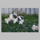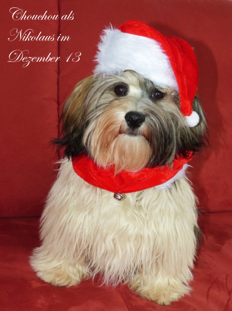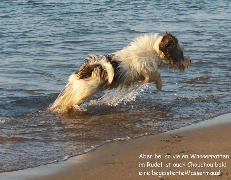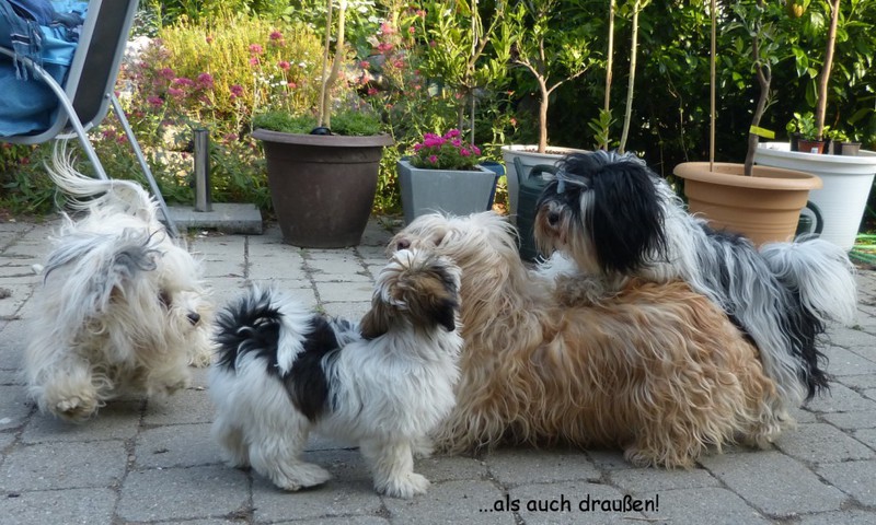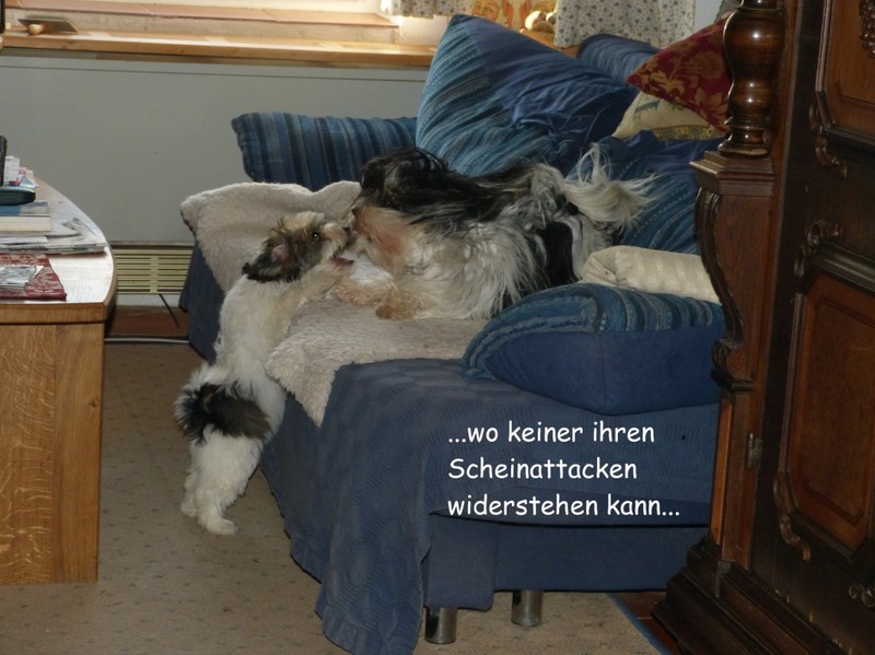 Chouchou ist eine echte Lady! Nicht nur, was ihre äußerst reizende und elegante Erscheinung anbelangt. Auch vom Wesen her ist sie bei allem Temperament keine Dampfwalze. Sanft, geschickt, diplomatisch, fast unmerklich, aber beharrlich verfolgt sie im Rudel ihre Interessen. So bekommt sie oft, was sie will, ohne dass die anderen gemerkt haben, dass sie sich durchgesetzt hat. Nur wenn es etwas zum Essen gibt, verhält sie sich so gar nicht ladylike, sondern mutiert zum blitzschnellen Räuber. Dabei ist sie so schnell und geschickt, dass man mit allen Wassern gewaschen sein muss, will man SELBER bestimmen, WELCHES Leckerchen in WELCHEM MAUL landet. Notfalls fischt sie noch schnell etwas aus einem Landseerschlund oder berechnet die Flugbahn eines Leckerchens so exakt, dass dieses in IHREM Magen landet statt in dem anvisierten. Diese Verfressenheit ist so gar nicht havanesertypisch - die meisten Havis fallen da ja eher durch eine ausgesprochene Mäkeligkeit auf. Zumindest muss ein dargebotener Leckerbissen erst einmal ausgiebig beschnüffelt werden, bis Hund entscheidet, ob er gerade genehm ist oder nicht. Hierin scheint sich Chouchou also eher die Landseer zum Vorbild genommen zu haben.