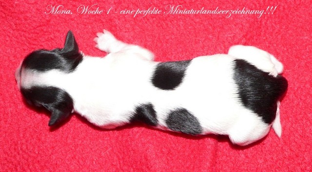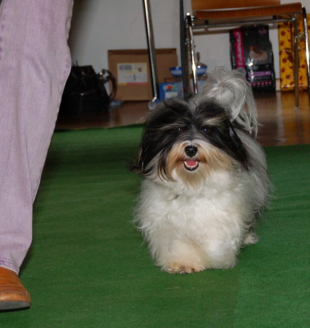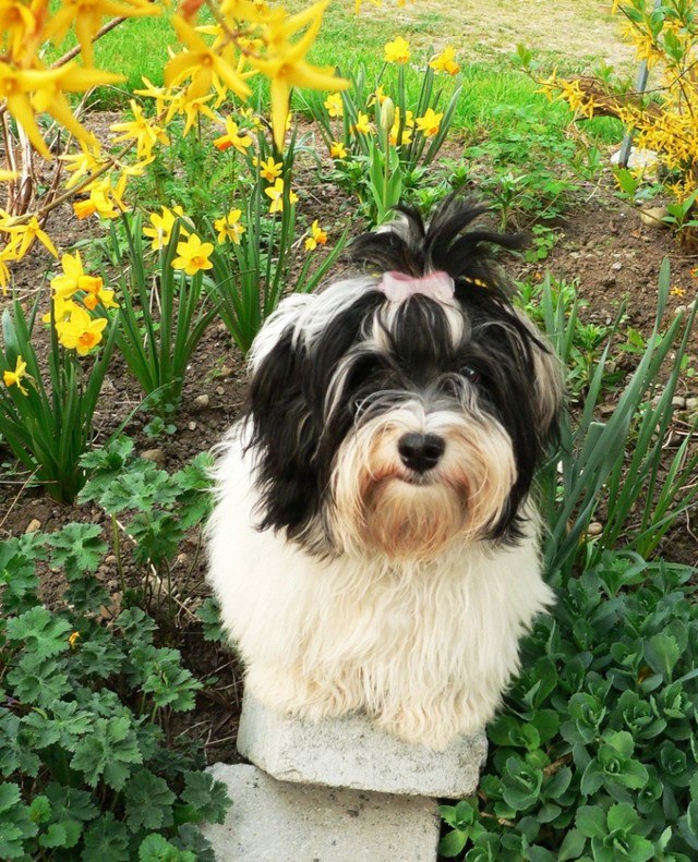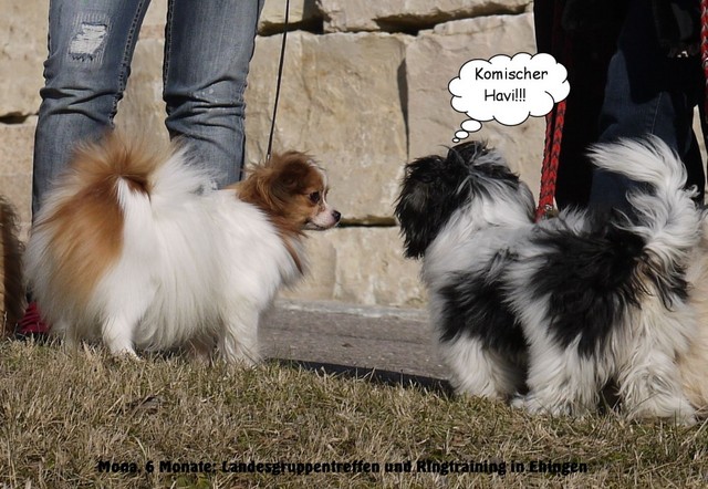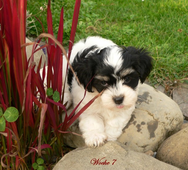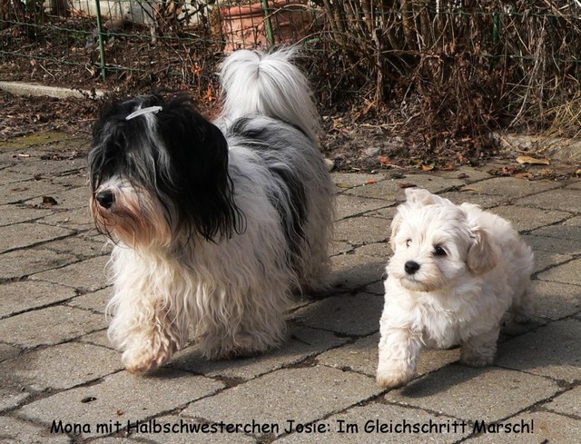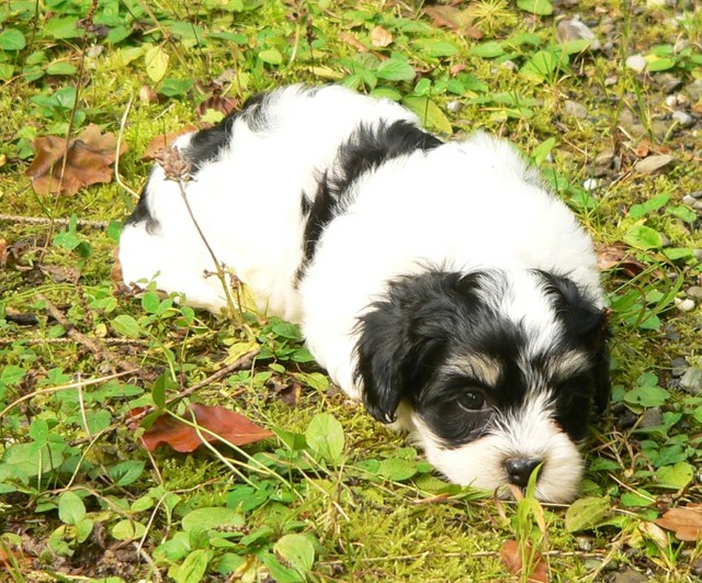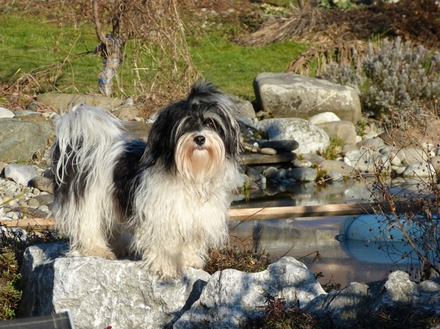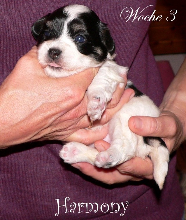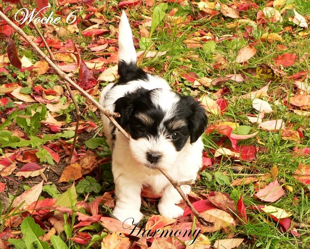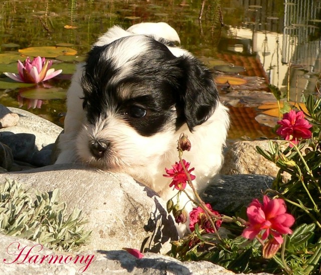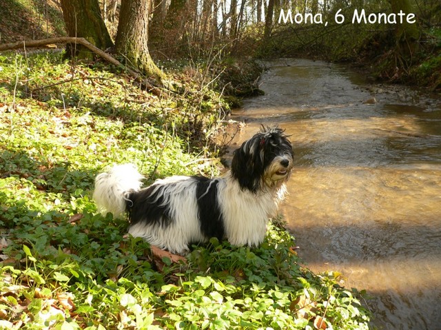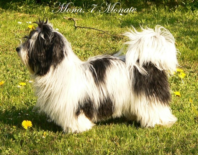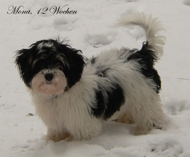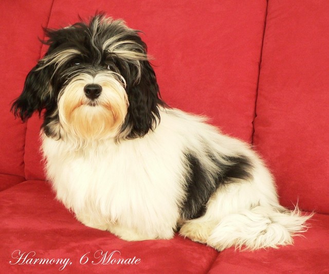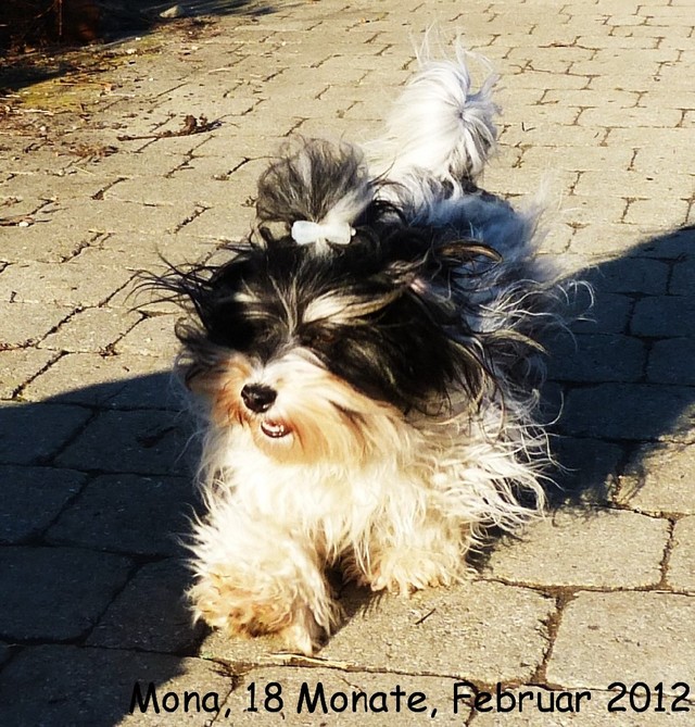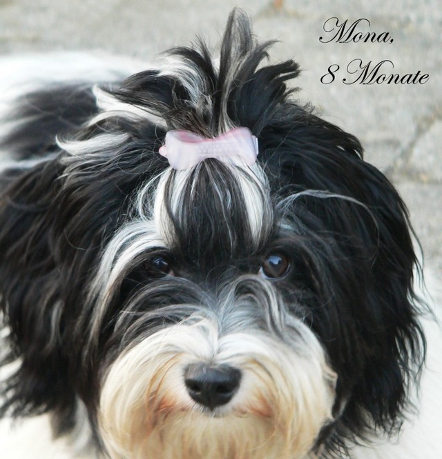 Unsere Harmony vom Birkenhain (H-Wurf, geboren am 19.8.2010), genannt Mona, war der schwarz-weiße Miniaturlandseerl Mona ist eine intelligente und temperamentvolle Havihündin, die seit dem zarten Alter von acht Wochen das Zweibeinerrudel am Morgen mit einem kräftigen "Hohooo!" begrüßt. Überhaupt setzt sie alle Arten von Knurrlauten ein, um ihrem überschäumenden Gefühlsleben Ausdruck zu verleihen; während mancher Besucher dann mitunter etwas zusammenzuckt, wissen WIR, dass ihre Knurrlaute variantenreicher Ausdruck von Begeisterung und überbordender Lebensfreude sind: Havis tragen ihr Herz auf der Zunge! Mona ist stets klar im Kopf und weiß genau, was sie will und wie sie es erreichen kann. Mühelos setzt sie sich sogar gegenüber den Landseern durch - schließlich ist sie das Kind von Rudelchefin Gunni und gleicht dieser sowieso sehr im Wesen. Wie Gunni kann sie fernsehen und liebt Tierfilme. Mona ist ein äußerst humorvoller Hund, der sogar lachen kann. Wahrscheinlich auch weil sie unser jüngstes Nesthäkchen ist und wir ihre Schlitzohrigkeit und Verschmitztheit einfach zu putzig finden, mangelt es ihr noch etwas an Seriosität und innerer Reife. Sockenverschleppen macht aber auch tierisch Spaß! Kein Gang morgens aus dem Schafzimmer ohne ein Wäschesouvenir von Frauchen ..unten an der Treppen noch schnell einen Socken von Herrchen und ab damit raus ins Grüne .. Spätestens wenn sich die Teile dann wieder einmal um das Innenleben des Rasenmähers wickeln, nehme ich mir vor, diesem Treiben endgültig Einhalt zu gebieten .. aber Monis breites Grinsen bis über beide Ohren, das freudige Getrippel mit hocherhobener Rute und das triumphale Imponiertragen der Beute am nächsten Tag lassen mich diesen Vorsatz dann wieder vertagen .. Bei allem Temperament und halbstarkem Übermut ist Mona aber durchaus gehorsam und havanesertypisch folgsam und anpassungswillig. Sie will nicht renitent sein, sondern gefallen. In Windeseile lernt sie Vokabeln und entwirft kreativ neue, tolle Spielideen, denen keiner widerstehen kann. So bringt sie als Betriebsnudel immer wieder Schwung in die Bude. Besonders wenn Welpen da sind, nimmt sie sich begeistert der Kleinen an - spätestens wenn diese dann so groß sind, dass man ordentlich Fangespielen kann, ist sie der absolute Star und genießt es in vollen Zügen, wie die Kleinen sie anhimmeln und ihr nachzueifern versuchen oder ihre Rase-Show-Runden mit heruntergeklapptem Kiefer und staunendem Blick verfolgen. Finden sich keine Spielpartner, nimmt sie sich aber nach Havaneserart auch zurück und kann stundenlang dösen oder schmusen und kuscheln. Am liebsten steigt sie dabei auf die Sofalehne und schmiegt sich gaaanz eng an die Wangen ihrer Zweibeiner.