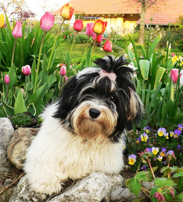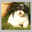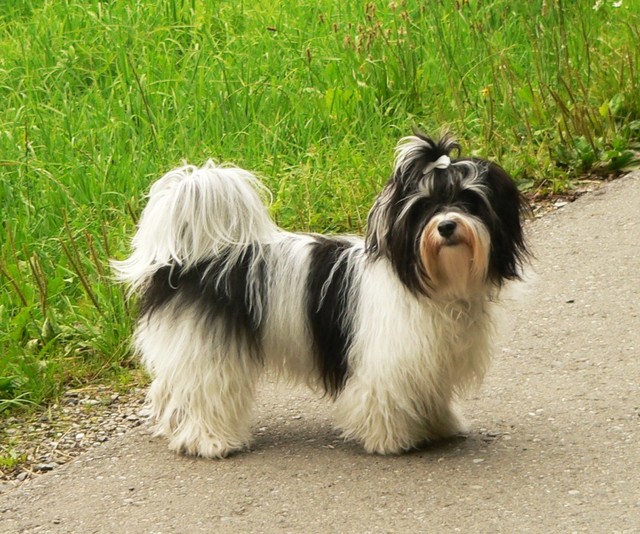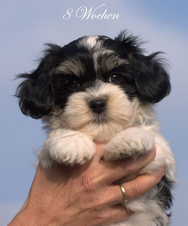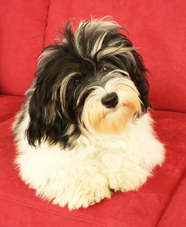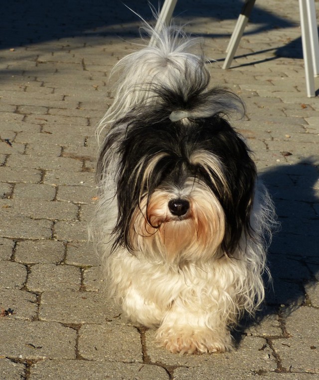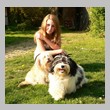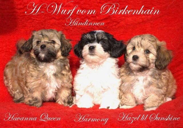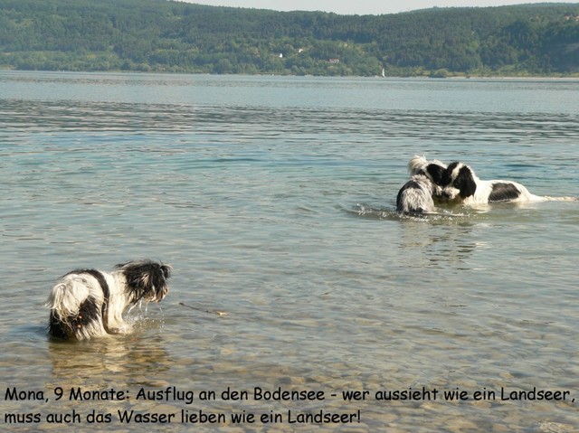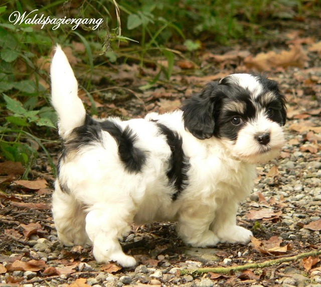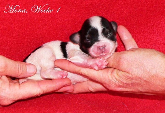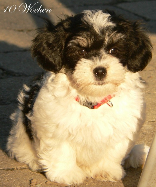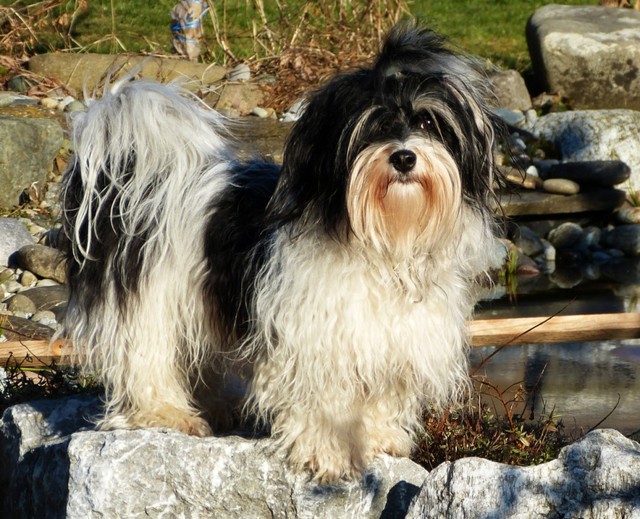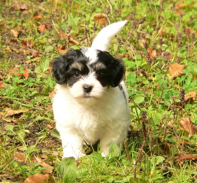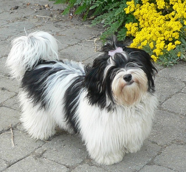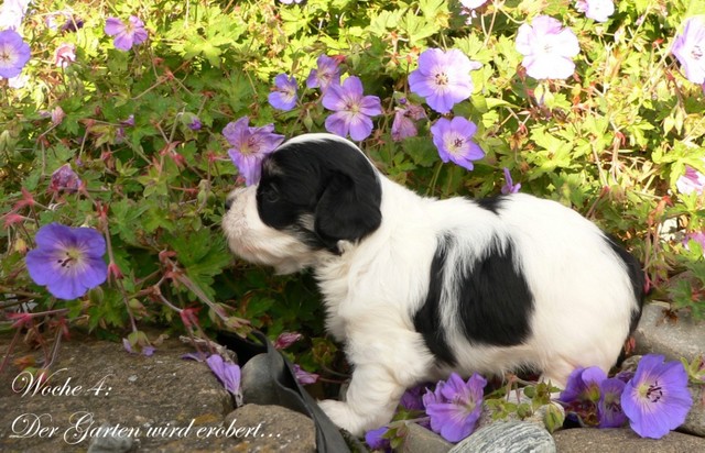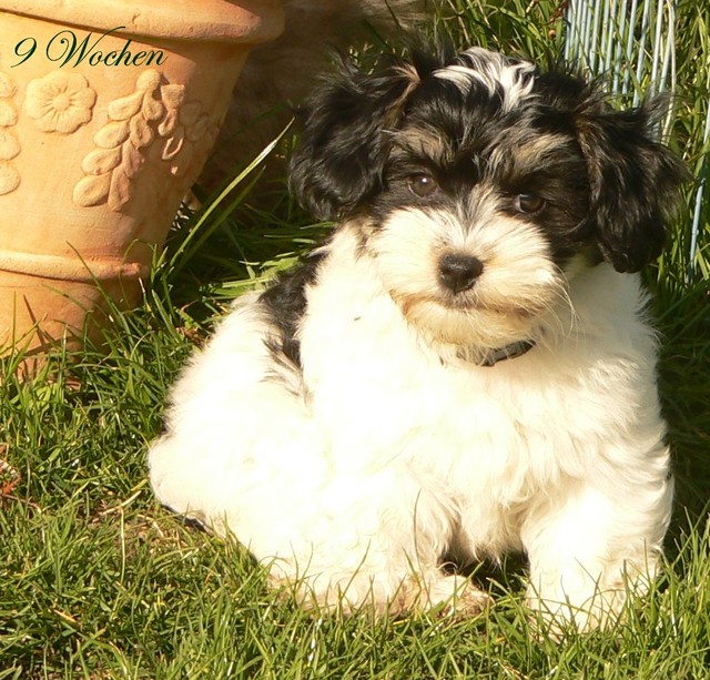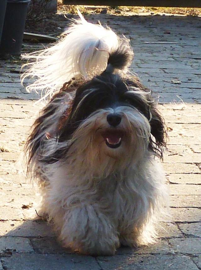 Unsere Harmony vom Birkenhain (H-Wurf, geboren am 19.8.2010), genannt Mona, war der schwarz-weiße Miniaturlandseerl Mona ist eine intelligente und temperamentvolle Havihündin, die seit dem zarten Alter von acht Wochen das Zweibeinerrudel am Morgen mit einem kräftigen "Hohooo!" begrüßt. Überhaupt setzt sie alle Arten von Knurrlauten ein, um ihrem überschäumenden Gefühlsleben Ausdruck zu verleihen; während mancher Besucher dann mitunter etwas zusammenzuckt, wissen WIR, dass ihre Knurrlaute variantenreicher Ausdruck von Begeisterung und überbordender Lebensfreude sind: Havis tragen ihr Herz auf der Zunge! Mona ist stets klar im Kopf und weiß genau, was sie will und wie sie es erreichen kann. Mühelos setzt sie sich sogar gegenüber den Landseern durch - schließlich ist sie das Kind von Rudelchefin Gunni und gleicht dieser sowieso sehr im Wesen. Wie Gunni kann sie fernsehen und liebt Tierfilme. Mona ist ein äußerst humorvoller Hund, der sogar lachen kann. Wahrscheinlich auch weil sie unser jüngstes Nesthäkchen ist und wir ihre Schlitzohrigkeit und Verschmitztheit einfach zu putzig finden, mangelt es ihr noch etwas an Seriosität und innerer Reife. Sockenverschleppen macht aber auch tierisch Spaß! Kein Gang morgens aus dem Schafzimmer ohne ein Wäschesouvenir von Frauchen ..unten an der Treppen noch schnell einen Socken von Herrchen und ab damit raus ins Grüne .. Spätestens wenn sich die Teile dann wieder einmal um das Innenleben des Rasenmähers wickeln, nehme ich mir vor, diesem Treiben endgültig Einhalt zu gebieten .. aber Monis breites Grinsen bis über beide Ohren, das freudige Getrippel mit hocherhobener Rute und das triumphale Imponiertragen der Beute am nächsten Tag lassen mich diesen Vorsatz dann wieder vertagen .. Bei allem Temperament und halbstarkem Übermut ist Mona aber durchaus gehorsam und havanesertypisch folgsam und anpassungswillig. Sie will nicht renitent sein, sondern gefallen. In Windeseile lernt sie Vokabeln und entwirft kreativ neue, tolle Spielideen, denen keiner widerstehen kann. So bringt sie als Betriebsnudel immer wieder Schwung in die Bude. Besonders wenn Welpen da sind, nimmt sie sich begeistert der Kleinen an - spätestens wenn diese dann so groß sind, dass man ordentlich Fangespielen kann, ist sie der absolute Star und genießt es in vollen Zügen, wie die Kleinen sie anhimmeln und ihr nachzueifern versuchen oder ihre Rase-Show-Runden mit heruntergeklapptem Kiefer und staunendem Blick verfolgen. Finden sich keine Spielpartner, nimmt sie sich aber nach Havaneserart auch zurück und kann stundenlang dösen oder schmusen und kuscheln. Am liebsten steigt sie dabei auf die Sofalehne und schmiegt sich gaaanz eng an die Wangen ihrer Zweibeiner.