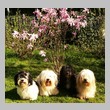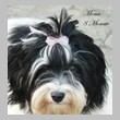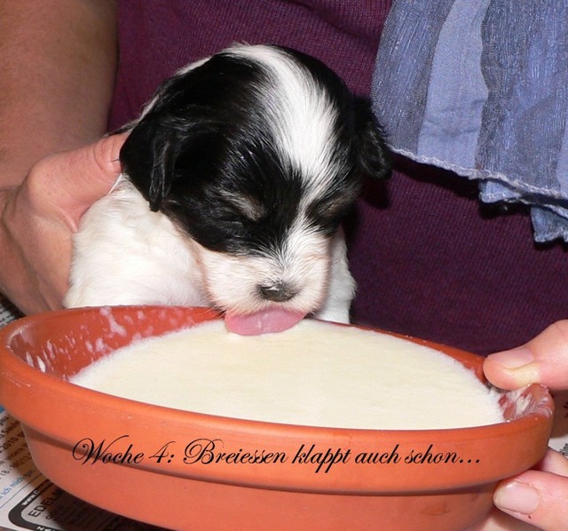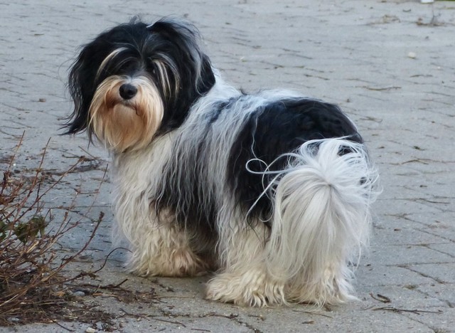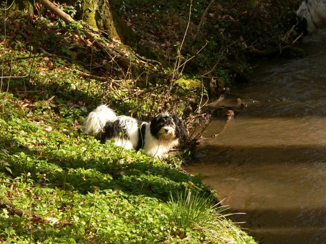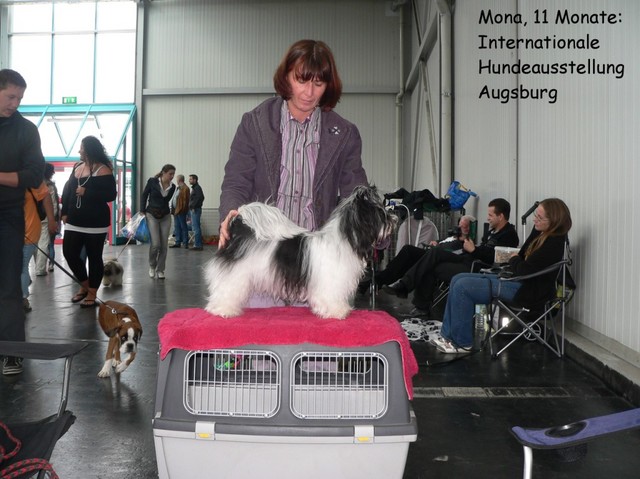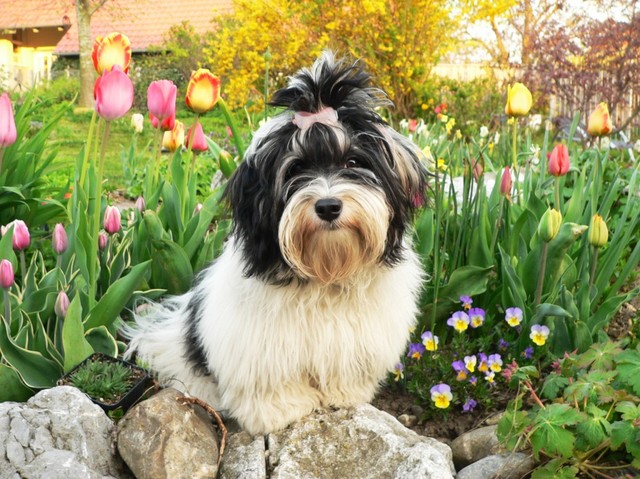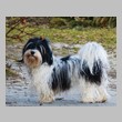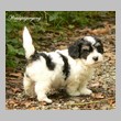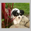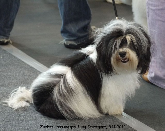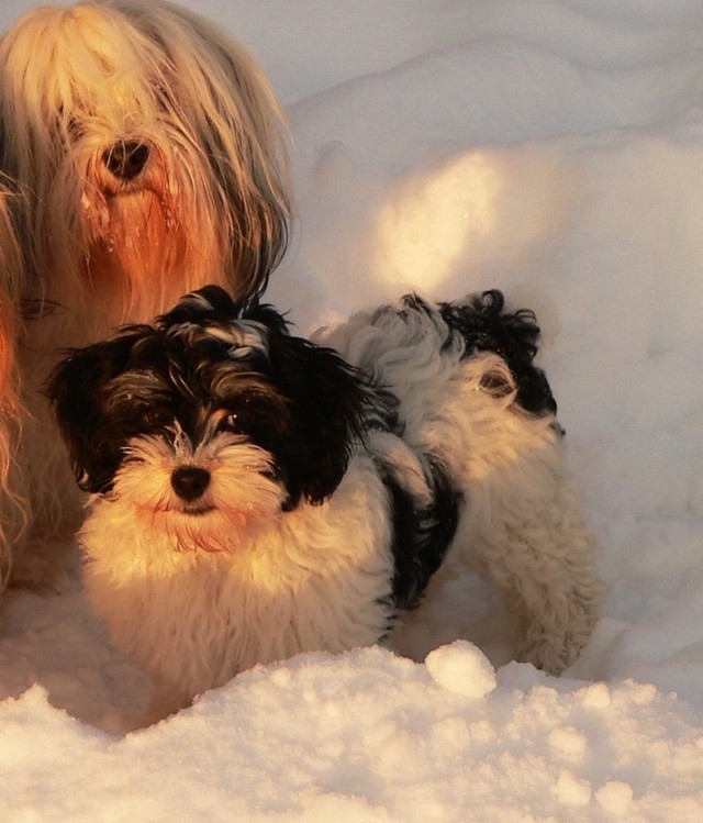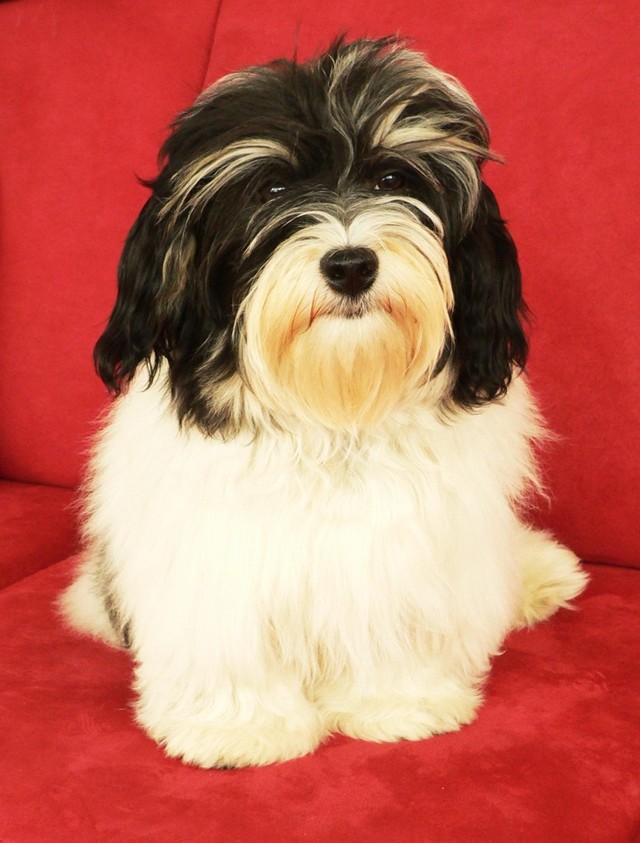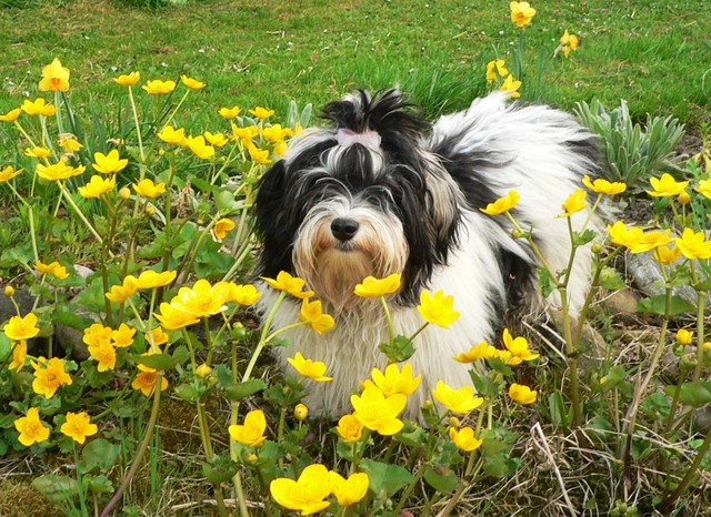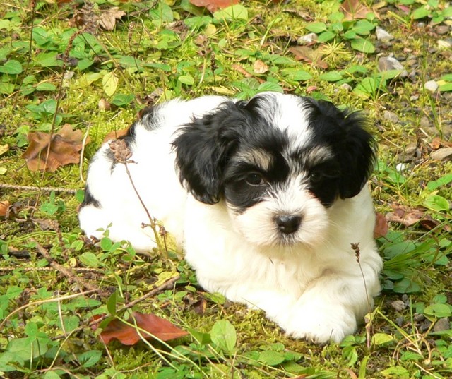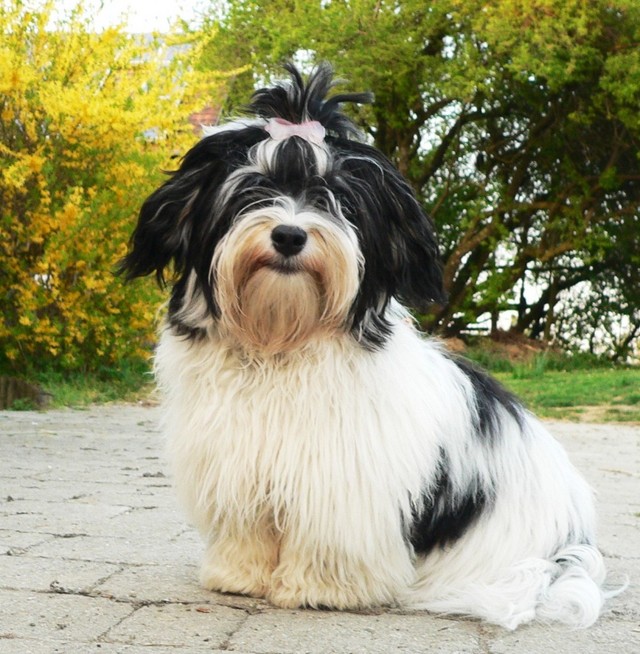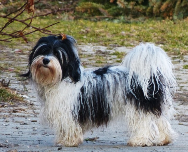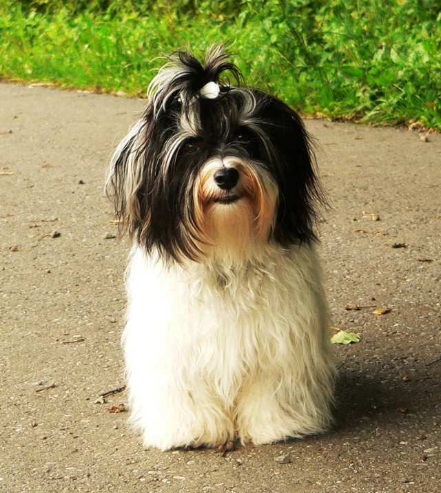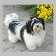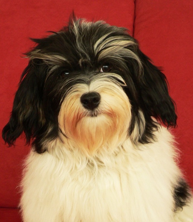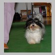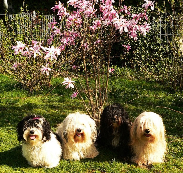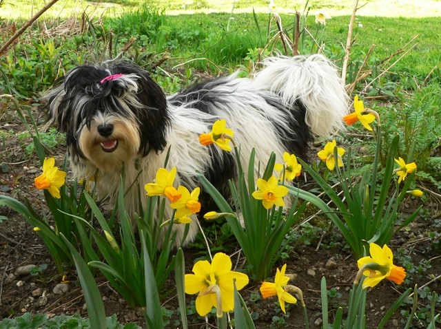 Unsere Harmony vom Birkenhain (H-Wurf, geboren am 19.8.2010), genannt Mona, war der schwarz-weiße Miniaturlandseerl Mona ist eine intelligente und temperamentvolle Havihündin, die seit dem zarten Alter von acht Wochen das Zweibeinerrudel am Morgen mit einem kräftigen "Hohooo!" begrüßt. Überhaupt setzt sie alle Arten von Knurrlauten ein, um ihrem überschäumenden Gefühlsleben Ausdruck zu verleihen; während mancher Besucher dann mitunter etwas zusammenzuckt, wissen WIR, dass ihre Knurrlaute variantenreicher Ausdruck von Begeisterung und überbordender Lebensfreude sind: Havis tragen ihr Herz auf der Zunge! Mona ist stets klar im Kopf und weiß genau, was sie will und wie sie es erreichen kann. Mühelos setzt sie sich sogar gegenüber den Landseern durch - schließlich ist sie das Kind von Rudelchefin Gunni und gleicht dieser sowieso sehr im Wesen. Wie Gunni kann sie fernsehen und liebt Tierfilme. Mona ist ein äußerst humorvoller Hund, der sogar lachen kann. Wahrscheinlich auch weil sie unser jüngstes Nesthäkchen ist und wir ihre Schlitzohrigkeit und Verschmitztheit einfach zu putzig finden, mangelt es ihr noch etwas an Seriosität und innerer Reife. Sockenverschleppen macht aber auch tierisch Spaß! Kein Gang morgens aus dem Schafzimmer ohne ein Wäschesouvenir von Frauchen ..unten an der Treppen noch schnell einen Socken von Herrchen und ab damit raus ins Grüne .. Spätestens wenn sich die Teile dann wieder einmal um das Innenleben des Rasenmähers wickeln, nehme ich mir vor, diesem Treiben endgültig Einhalt zu gebieten .. aber Monis breites Grinsen bis über beide Ohren, das freudige Getrippel mit hocherhobener Rute und das triumphale Imponiertragen der Beute am nächsten Tag lassen mich diesen Vorsatz dann wieder vertagen .. Bei allem Temperament und halbstarkem Übermut ist Mona aber durchaus gehorsam und havanesertypisch folgsam und anpassungswillig. Sie will nicht renitent sein, sondern gefallen. In Windeseile lernt sie Vokabeln und entwirft kreativ neue, tolle Spielideen, denen keiner widerstehen kann. So bringt sie als Betriebsnudel immer wieder Schwung in die Bude. Besonders wenn Welpen da sind, nimmt sie sich begeistert der Kleinen an - spätestens wenn diese dann so groß sind, dass man ordentlich Fangespielen kann, ist sie der absolute Star und genießt es in vollen Zügen, wie die Kleinen sie anhimmeln und ihr nachzueifern versuchen oder ihre Rase-Show-Runden mit heruntergeklapptem Kiefer und staunendem Blick verfolgen. Finden sich keine Spielpartner, nimmt sie sich aber nach Havaneserart auch zurück und kann stundenlang dösen oder schmusen und kuscheln. Am liebsten steigt sie dabei auf die Sofalehne und schmiegt sich gaaanz eng an die Wangen ihrer Zweibeiner.