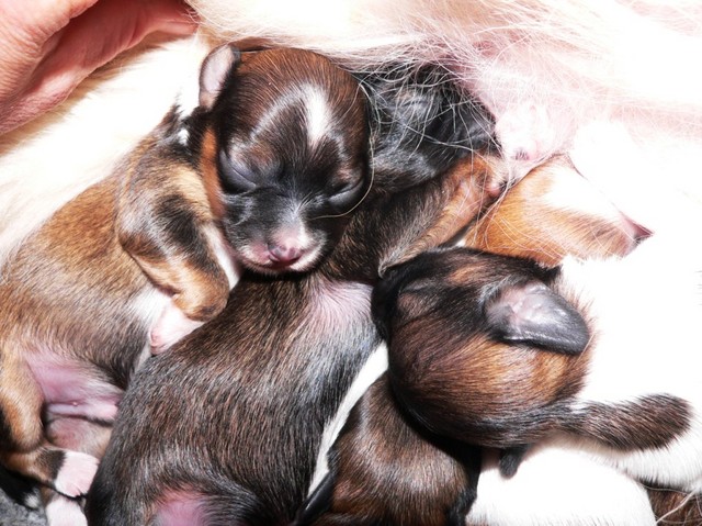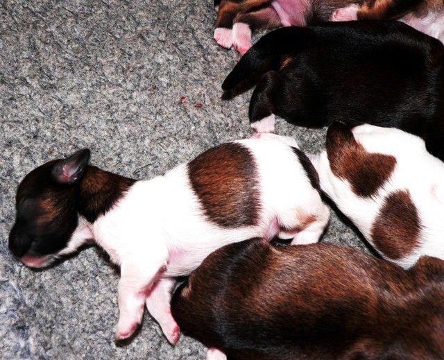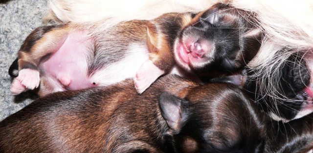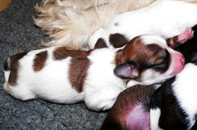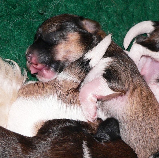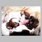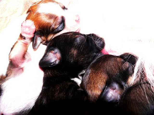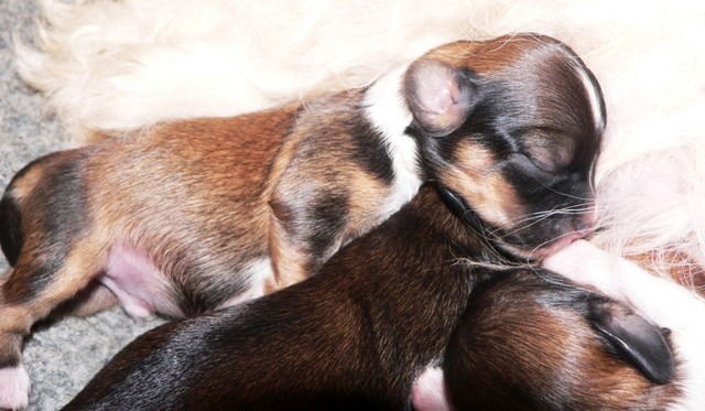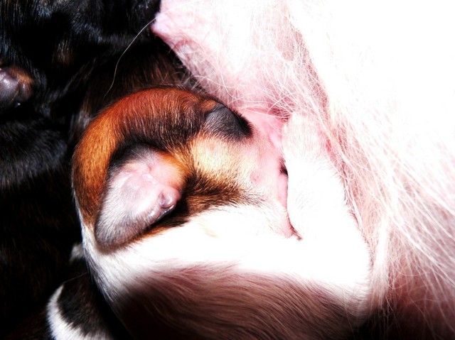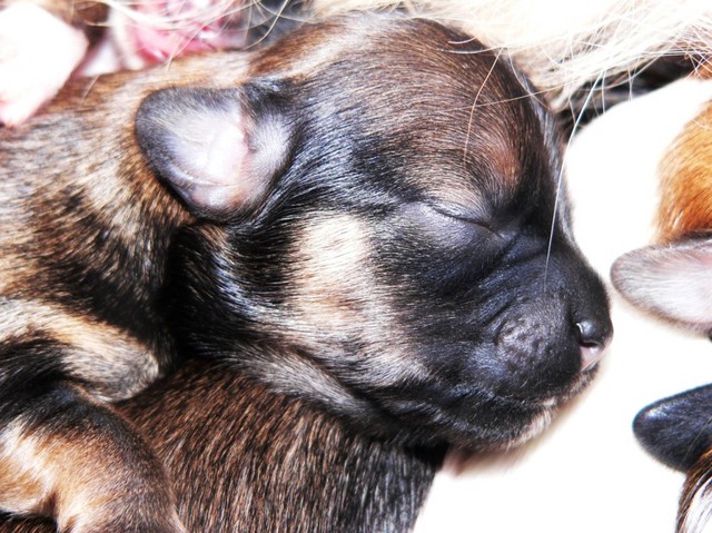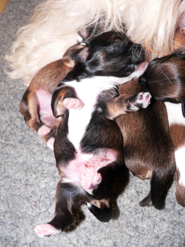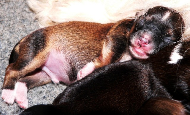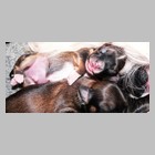 Die Babys zeigen inzwischen einen gemeinsamen Schlaf-Wach-Rhythmus. Sind sie wach, dann geht es hoch her in der Kiste: Jeder Welpe versucht voll Tatendrang, eine Zitze zu erwischen und tut lautstark seinen Protest kund, wenn ihm das nicht gleich gelingt, weil sich ihm Geschwister in den Weg stellen...