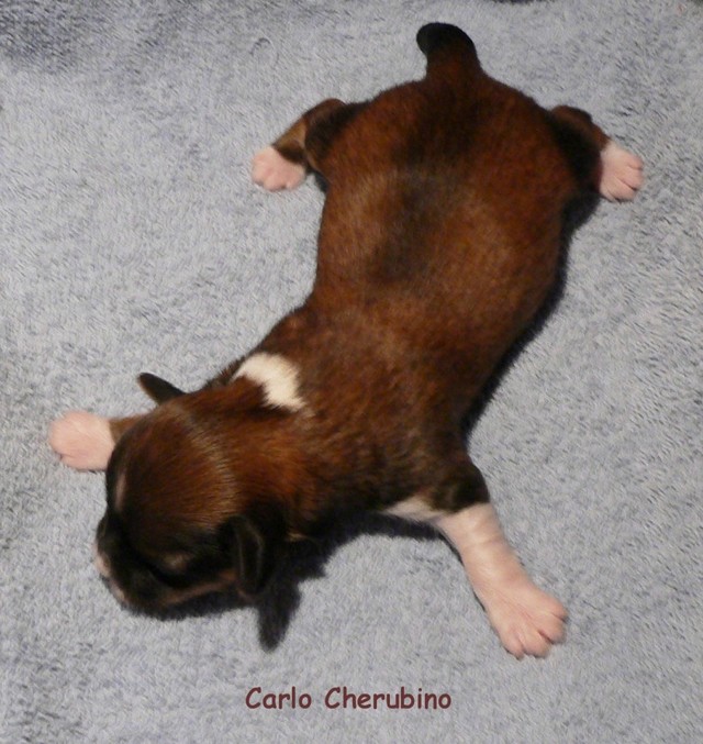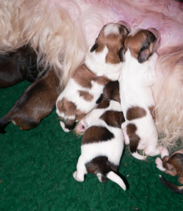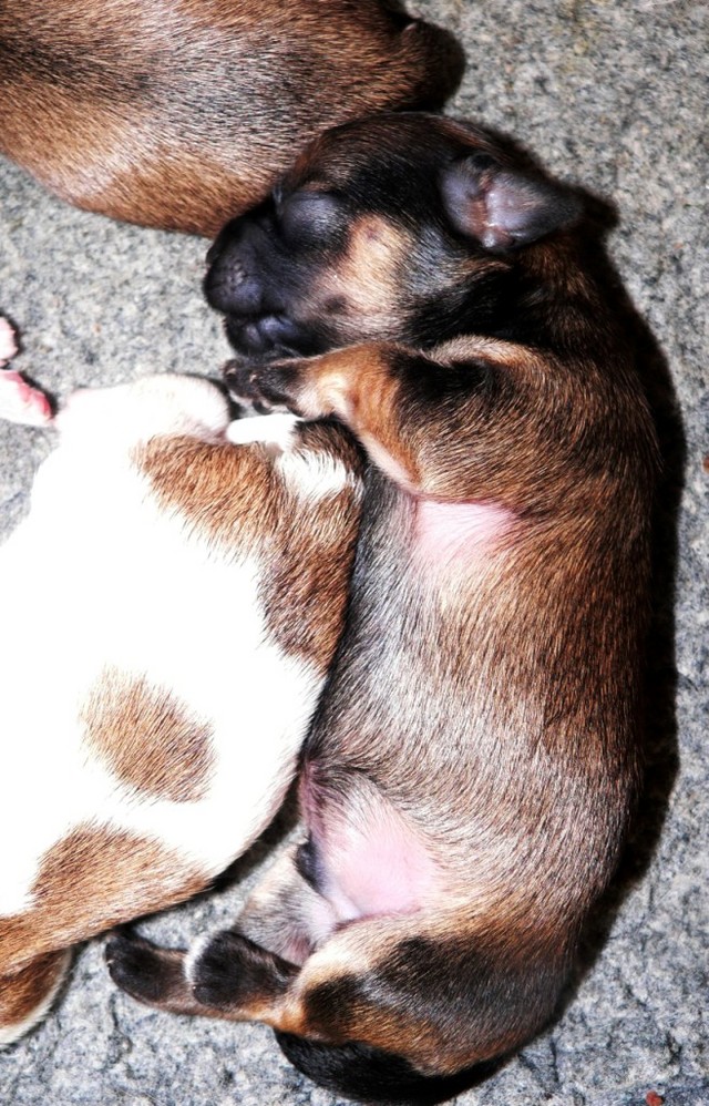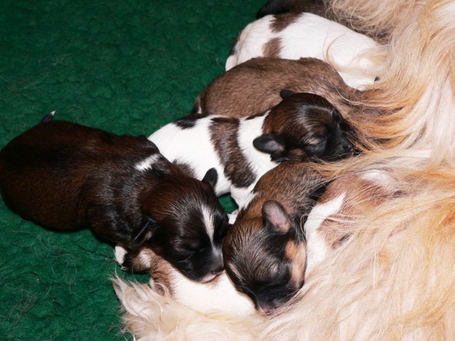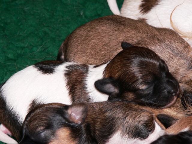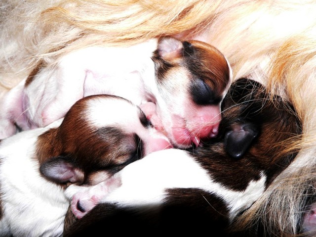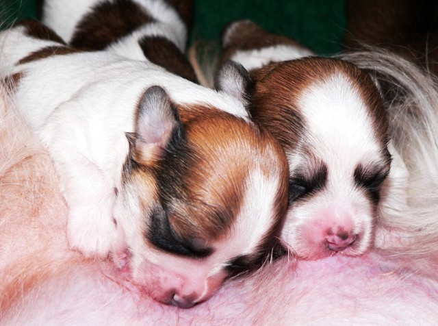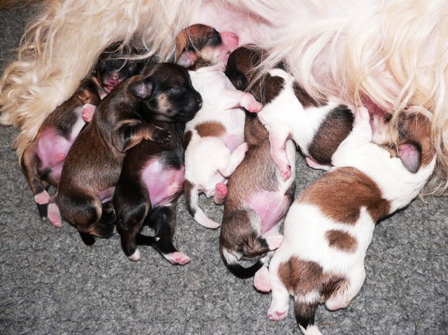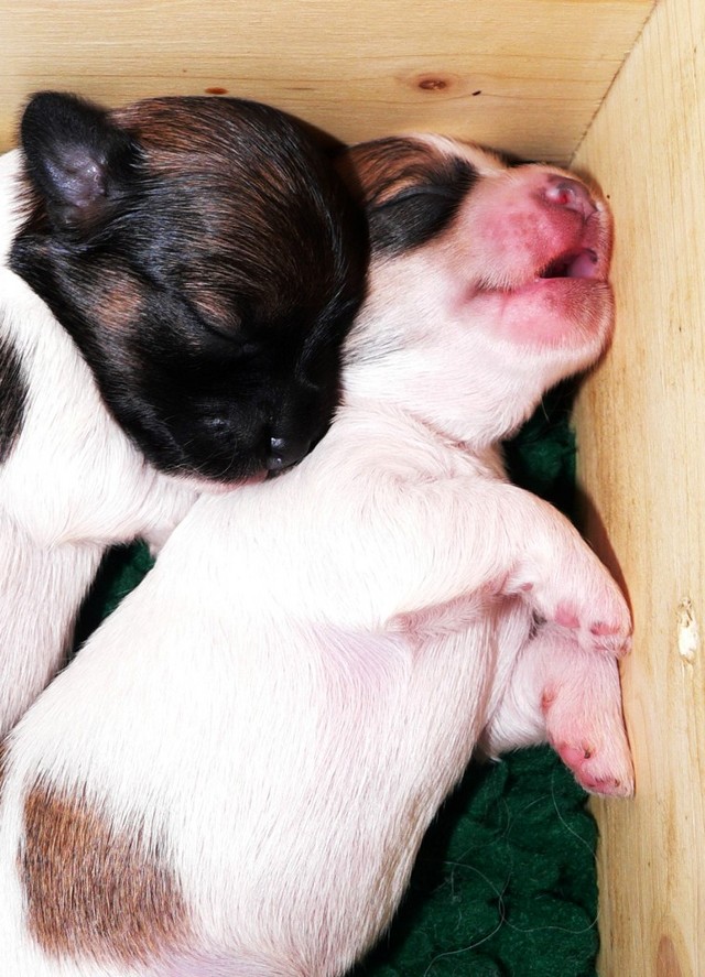 Die Babys zeigen inzwischen einen gemeinsamen Schlaf-Wach-Rhythmus. Sind sie wach, dann geht es hoch her in der Kiste: Jeder Welpe versucht voll Tatendrang, eine Zitze zu erwischen und tut lautstark seinen Protest kund, wenn ihm das nicht gleich gelingt, weil sich ihm Geschwister in den Weg stellen...