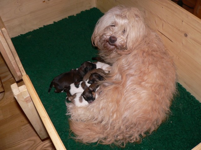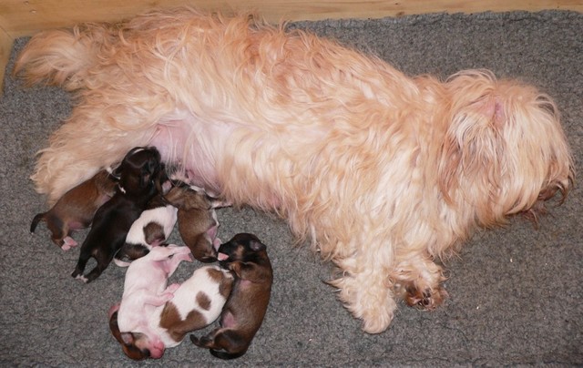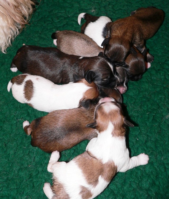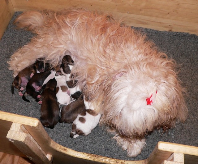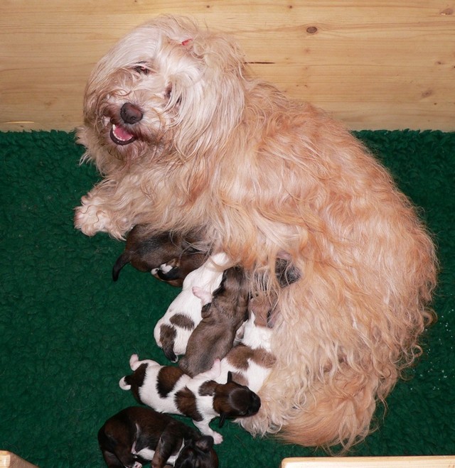 Unsere sieben Zwerge sind jetzt eine Woche alt. Bereits am fünften Tag haben sie - in Rekordzeit - ihr Gewicht verdoppelt: Mutter Gunni hat herrlich viel Milch! Es ist schön zu beobachten, wie sehr sie ihre Babys genießt. Inzwischen erlaubt sie auch den anderen vierbeinigen Rudelmitgliedern, einen kurzen Blick in die Wurfkiste zu werfen. Noch aber will sie sich ganz alleine um die Kinder kümmern und gestattet keine weiteren Einmischungen von Frieda und Fifille, die gar zu gerne wenigstens beim Waschen helfen würden...