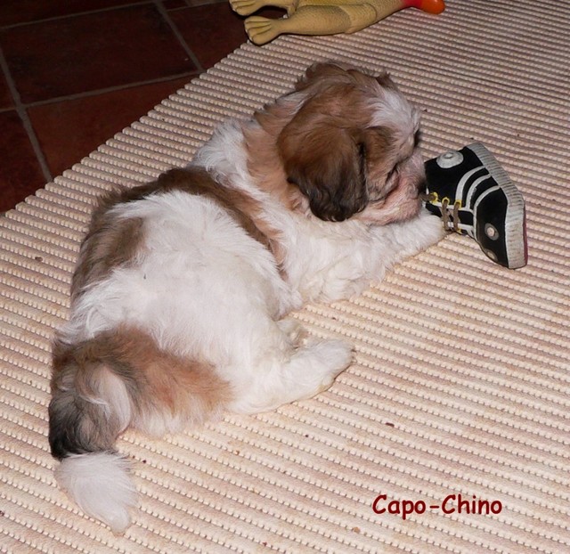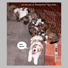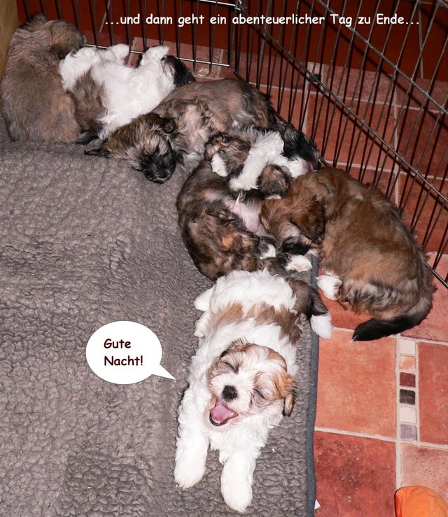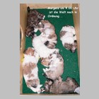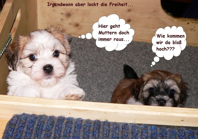 Unsere Welpen sind inzwischen sieben Wochen alt. Sie sind unglaublich flink und geschickt geworden. Erstmals hat es ein Hundekind geschafft, per Klimmzug die Wurfkiste über den hohen Rand zu verlassen. Zum Glück konnte der Ausbrecherkönig (Capo-Chino) noch rechtzeitig gefasst werden. Dank eines schnell konstruierten Überhangs werden hoffentlich künftig alle Fluchtversuche vereitelt...