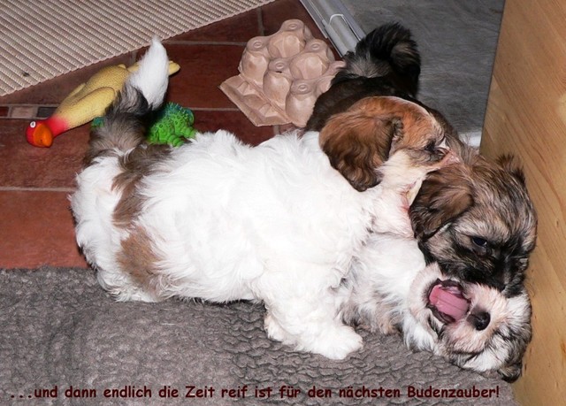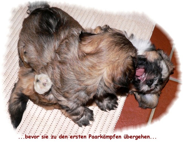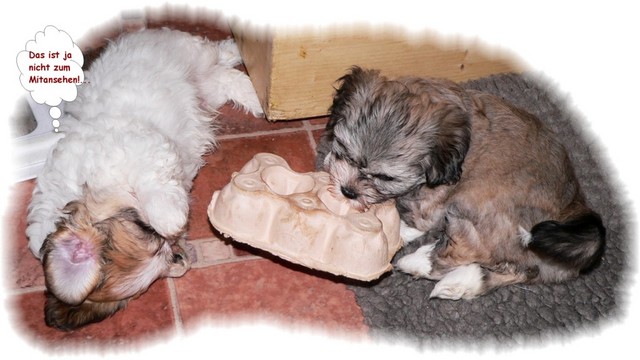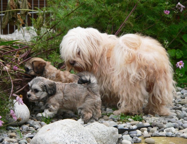 Allerdings steht nach solchen Badeversuchen und auch nach Schlammschlachten in der feuchten Erde in dieser Jahreszeit ein warmes Bad im Haus mit ausgiebigem Trockenföhnen an - diese Prozedur haben inzwischen alle Welpen mehrmals gut hinter sich gebracht.