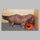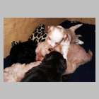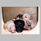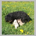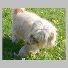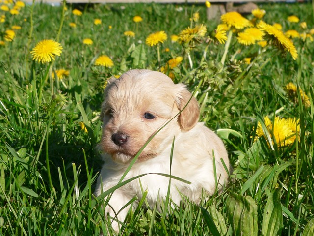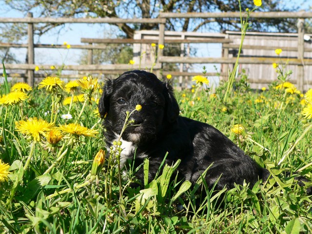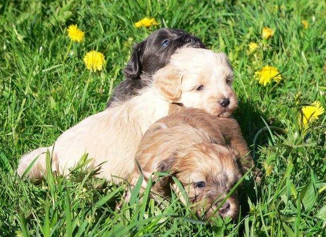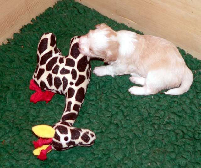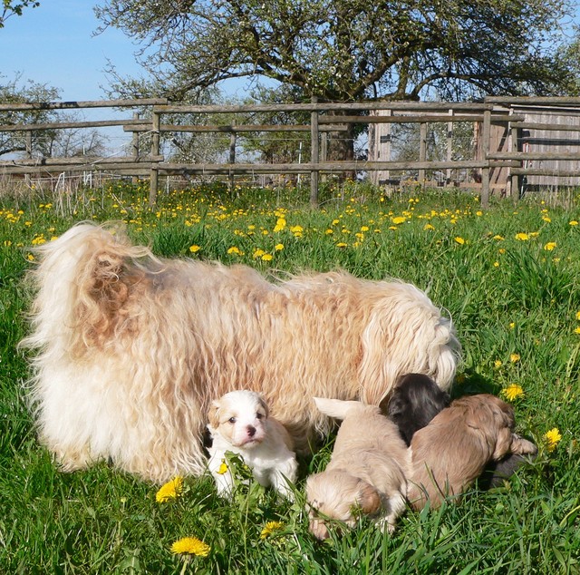 Unsere Hundekinder sind nun vier Wochen alt . Sie verlassen inzwischen selbstständig die Wurfkiste - und können auch wieder zurückfinden. Versperrt man kurzfristig mit Leisten den Eingang der Wurfkiste, erntet man entrüstetes Bellen und verzweifeltes Weinen ob des plötzlich eingeschränkten Spielraums. Havaneser merken sich genau, wo die bereits erkundete Welt aufhört und fordern früh und lautstark Einlass! Im Welpenauslauf inmitten unseres Wohn-/ Esszimmer- und Küchenbereichs gibt es viel zu erkunden. Unterschiedliche Unterlagen gewöhnen die Welpen an verschiedene Bodenbeschaffenheiten. Ein kleiner Tunnel erlaubt spannungsreiches Versteckspiel, aber eröffnet auch zusätzliche Rückzugsmöglichkeiten für müde Kandidaten. Diverse Spielsachen (die im Idealfall auch unterschiedliche Geräusche erzeugen) dienen zur zusätzlichen Unterhaltung. Behutsam gewöhnen wir die Babys an verschiedene Geräuschquellen des Alltags. Wichtig ist jetzt auch, dass die Hundekinder häufig Besuch erhalten - von Menschen verschiedenen Alters, unterschiedlichen Geschlechts und in abwechslungsreicher Kleidung. In den nächsten Wochen stehen deshalb auch immer wieder Besuche von Kindergartengruppen und Schulklassen auf dem Programm. Die Welpen entwickeln immer mehr motorisches Geschick: Die Bewegungen werden schneller und zielgerichteter - dennoch wirkt manche Attacke auf ein Spielzeug oder die Geschwister sehr erheiternd, da nicht selten der Angreifer noch über seine Füße stolpert oder bei einer blitzschnellen Drehung kurzfristig die Orientierung verliert. Dennoch zeigen die Welpen schon ein großes Repertoire an ererbten Verhaltensmustern: Spielaufforderungen, "Totschütteln", Mienenspiel und Schwanzwedeln, verschiedene Bell- und Knurrlaute, die unterschiedlichste Stimmungslagen zum Ausdruck bringen. Inzwischen bekommen unsere Babys zweimal täglich eine Mischung aus Milch- und Fleischbrei, die ihnen sehr gut schmeckt und sie richtig zittrig vor Aufregung über diese neue und reizvolle Nahrung werden lässt. Aufgrund des ausgesprochen warmen und fast sommerlich anmutenden Wetters können wir schon kleine Ausflüge in den Garten und auf die Weiden unternehmen. Noch ist der Erkundungsradius aber klein (ca. 5 Meter) und die Wachphasen dauern nur kurz an (nach 10 bis 15 Minuten ist wieder Schlafen angesagt...). Mutter Fifille lässt ihre Kinder besonders draußen nicht aus den Augen. Aber die restlichen Mitglieder des Rudels dürfen jetzt mehr und mehr Anteil nehmen und sich an der Beaufsichtigung der Kleinen beteiligen. So hat schon manches Baby eine richtige Katzenwäsche genossen - unter lautstarkem Protestgeschrei (man hat ja schließlich Dringenderes vor und für solche Eskapaden wenig Sinn...), welches unser Kater Mikesch aber ungerührt an sich abprallen lässt: Was sein muss, muss sein!