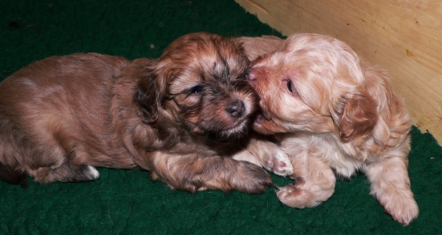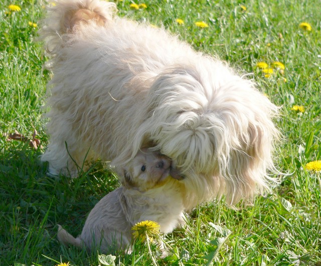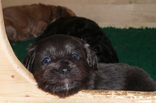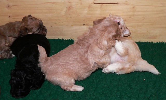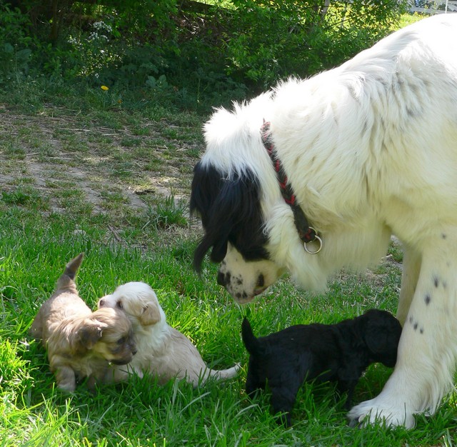 Unsere Welpen sind jetzt fast fünf Wochen alt. Sie fressen dreimal täglich mit Begeisterung ihren Milch-Fleisch-Brei, werden aber zusätzlich noch immer regelmäßig von Mutter Fifille gesäugt. Die Milchzähne brechen jetzt durch, was sich auch am starken Nagebedürfnis der Welpen zeigt.