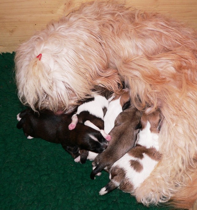 Unsere sieben Zwerge sind jetzt eine Woche alt. Bereits am fünften Tag haben sie - in Rekordzeit - ihr Gewicht verdoppelt: Mutter Gunni hat herrlich viel Milch! Es ist schön zu beobachten, wie sehr sie ihre Babys genießt. Inzwischen erlaubt sie auch den anderen vierbeinigen Rudelmitgliedern, einen kurzen Blick in die Wurfkiste zu werfen. Noch aber will sie sich ganz alleine um die Kinder kümmern und gestattet keine weiteren Einmischungen von Frieda und Fifille, die gar zu gerne wenigstens beim Waschen helfen würden...